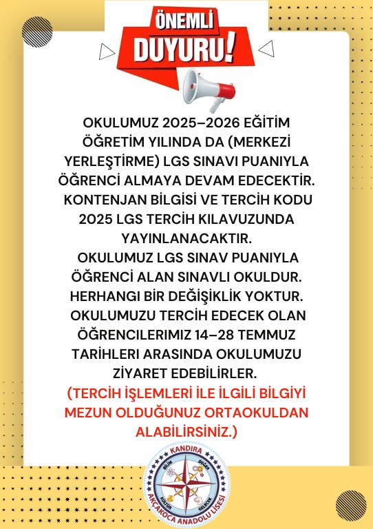 Kandıra Akçakoca Anadolu Lisesi, 2025–2026 eğitim-öğretim yılında da LGS puanı ile öğrenci alan nitelikli okullar arasında yer almaya devam edecektir. Okulumuz, Milli Eğitim Bakanlığı tarafından merkezi yerleştirme ile öğrenci alan sınavlı bir okuldur.